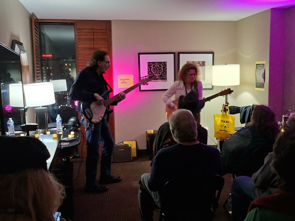 “Standing Ovation” was next, Freebo taking the lead again. The next song was from Alice, about her Dad, he passed when she was 18, “ a fine chap” she called him, “Forever Is A Long Time”, a very moving song. Alice taking lead guitar and vocals with Freebo’s bass meandering gently through the song. Very rapidly we were at the last song of the set. Another Alice song, “What About You”. The Merch desk was very busy at the interval.
