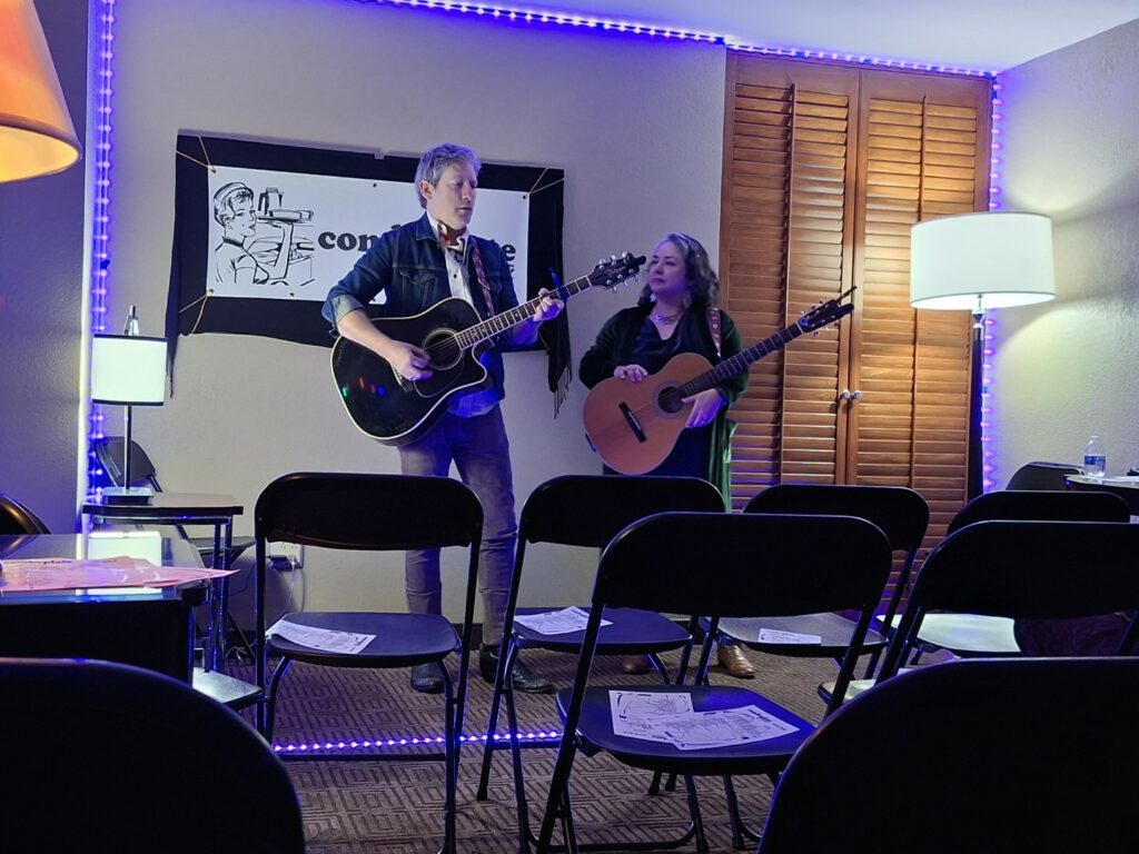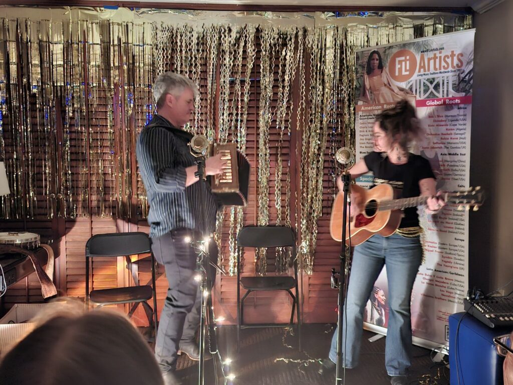 Sunday 2nd November 2025. The debut appearance of Alice Howe and Freebo at The Live Room, Saltaire. There was a good crowd but I think if we’re lucky enough for a second appearance it will be a sell out on word of mouth alone. “We’re so glad to be at The Live Room, it has the best wallpaper of everywhere”, they announced at the start of the show. The semi antique, post diluvian Workingmen’s Club décor at the Live Room attracts a lot of attention from our musical guests. Amazement or incredulity rather than admiration possibly.